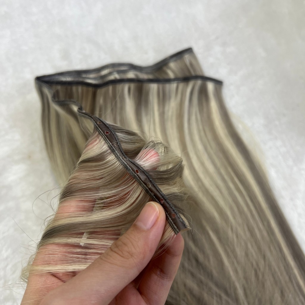 Injected wefts with two sides and holes in the middle are designed for durability and flexibility. The holes allow for secure attachment with various methods, such as sewing or bonding, while the two-sided design provides a natural look and even distribution of hair. This construction helps reduce bulk, enhances comfort, and ensures a seamless blend with natural hair. The weft made of injected skills, looks more invisible.