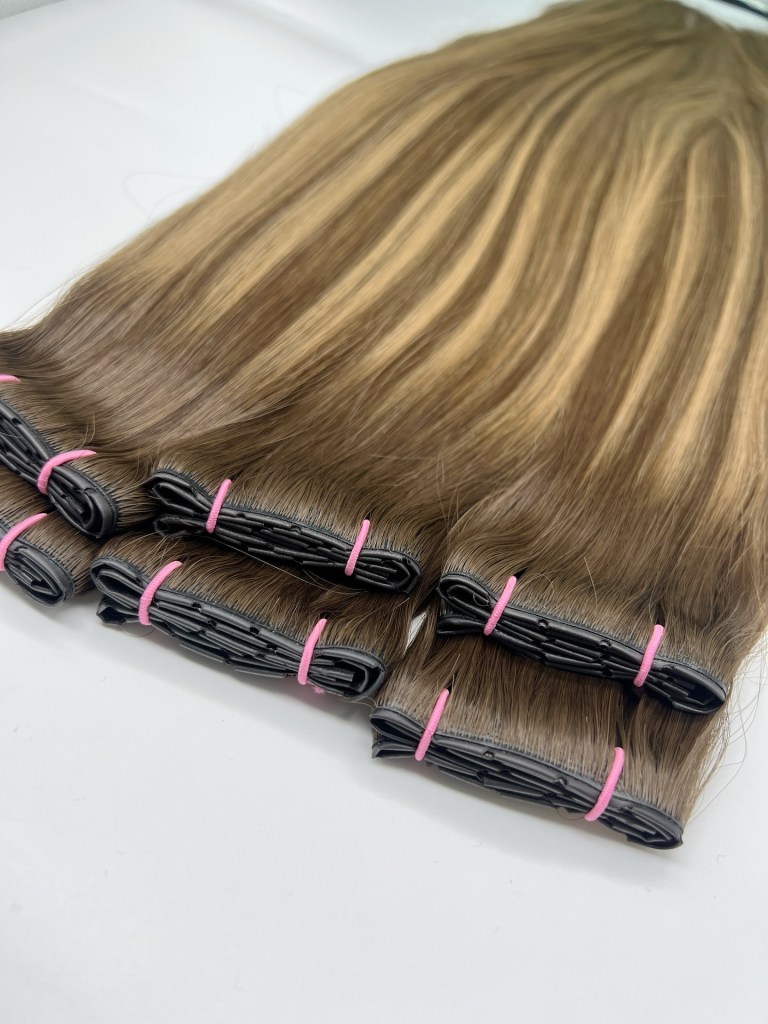 Classic machine weft hair extensions are durable and provide a consistent, even distribution of hair. They are pre-sewn onto a track, making them easy to apply and style. This method is ideal for adding volume and length while offering a secure and long-lasting hold.